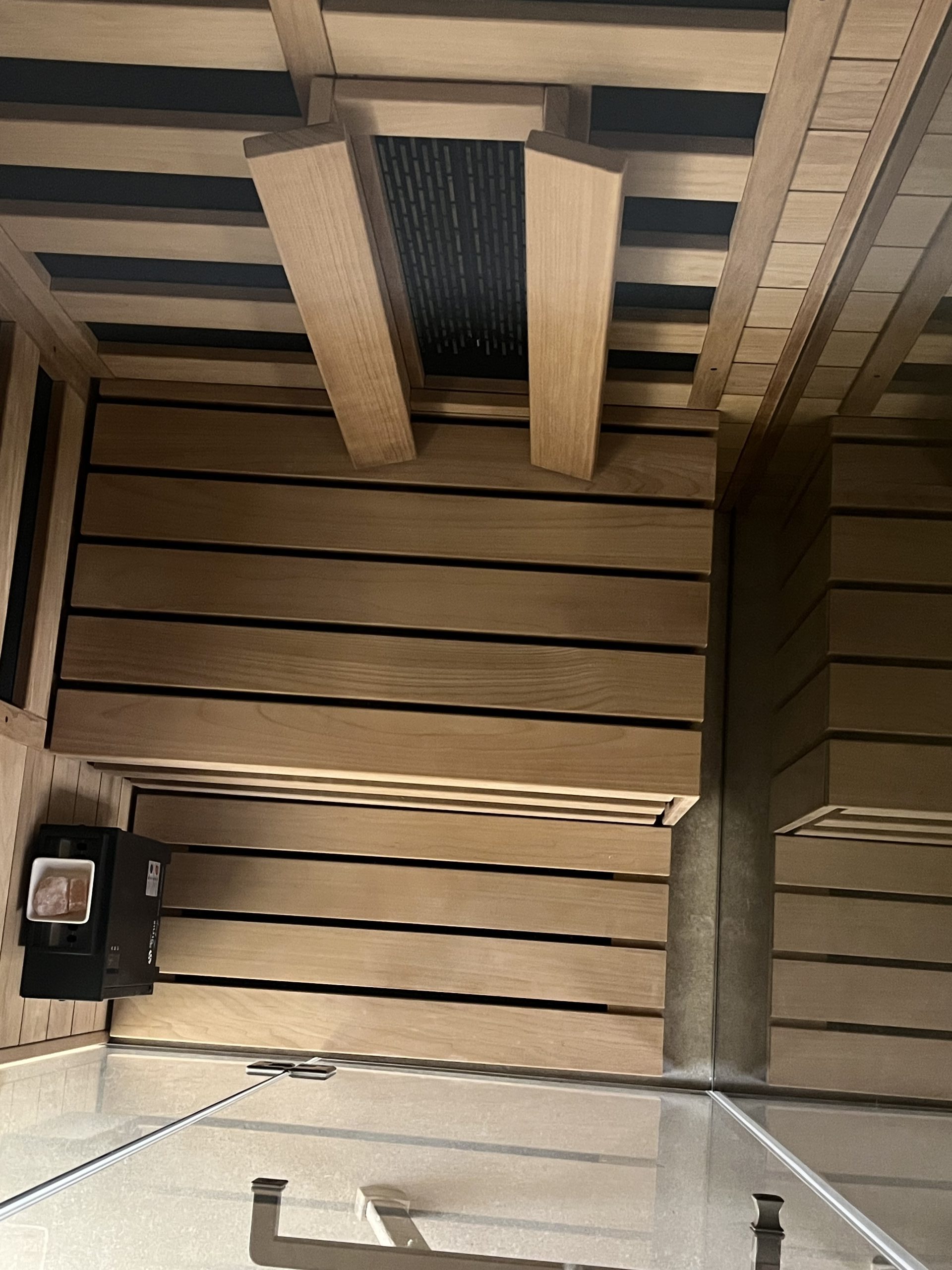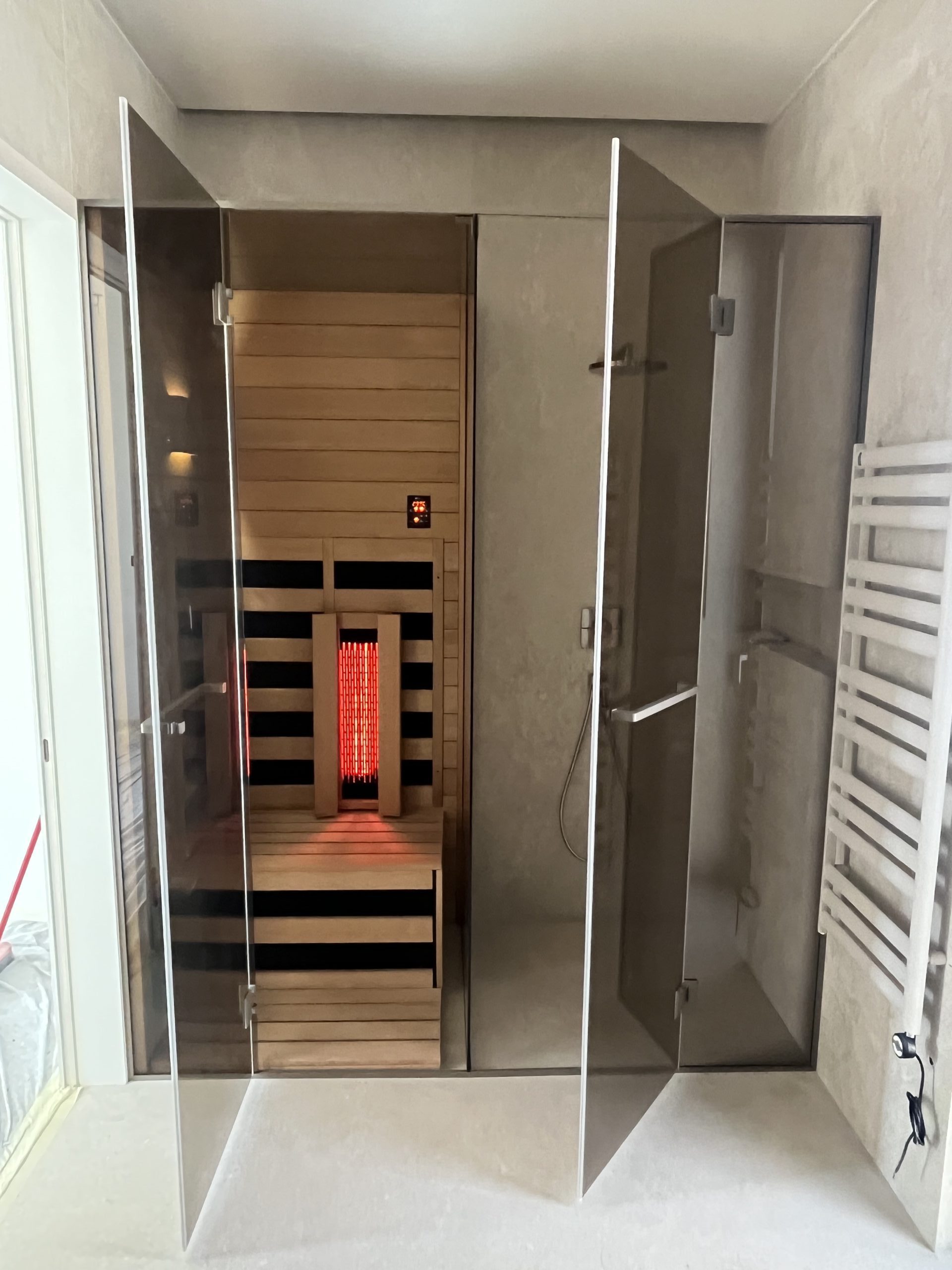Posebnost te savne je steklen strop, ki prostoru daje občutek odprtosti in dodatne svetlobe. Za še večje udobje in učinkovitost poskrbi tudi točkovni IR grelec, diskretno vgrajen v steno, ki omogoča ciljno usmerjeno toploto in izboljšano izkušnjo sprostitve.