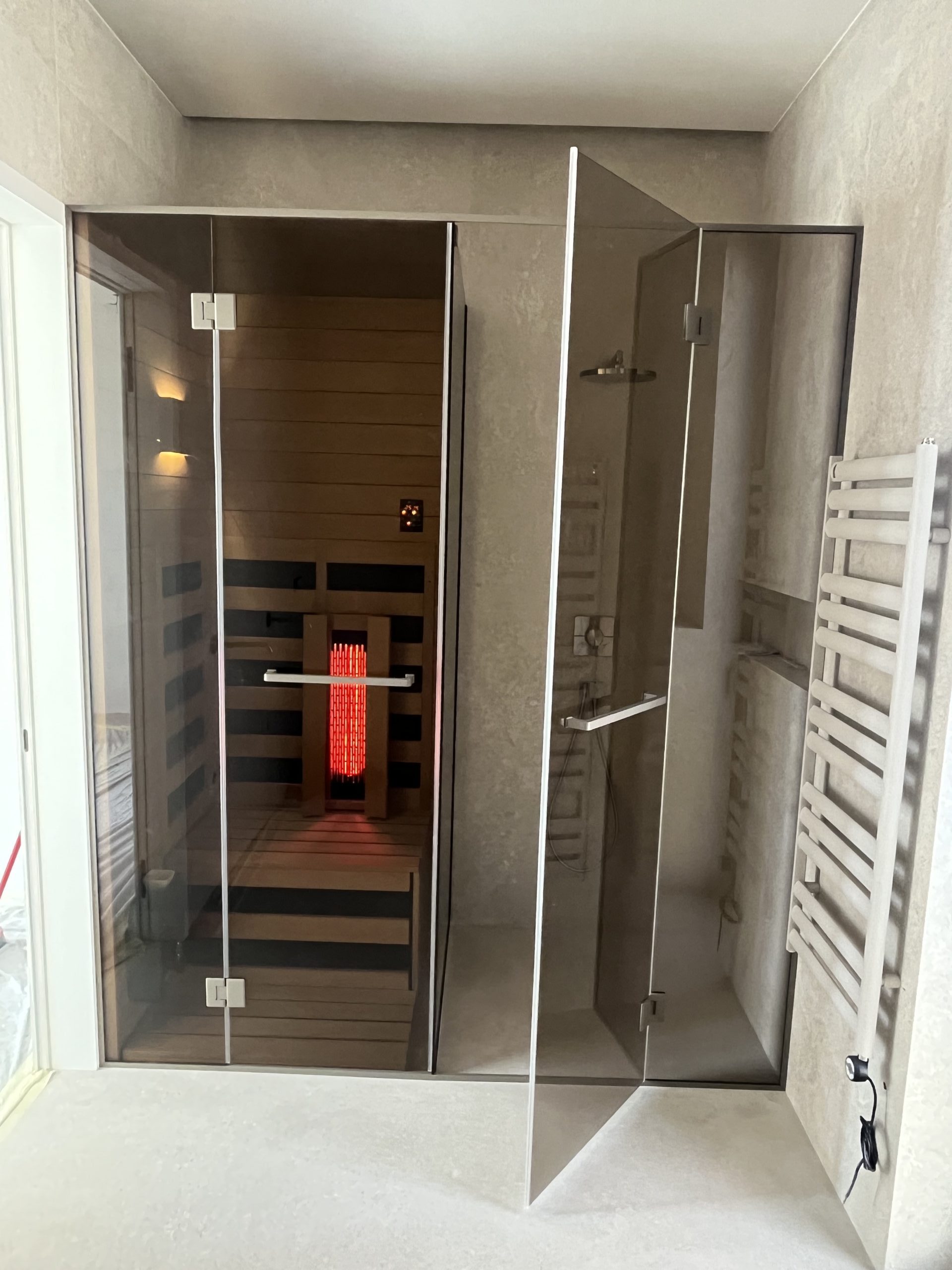 Predstavljamo vam našo infra solno savno iz kolekcije Termo Premium. Gre za dovršeno izvedbo savne, ki je elegantno povezana s tušem, pri čemer sta oba elementa vizualno usklajena z enotno barvo stekla in okovja.