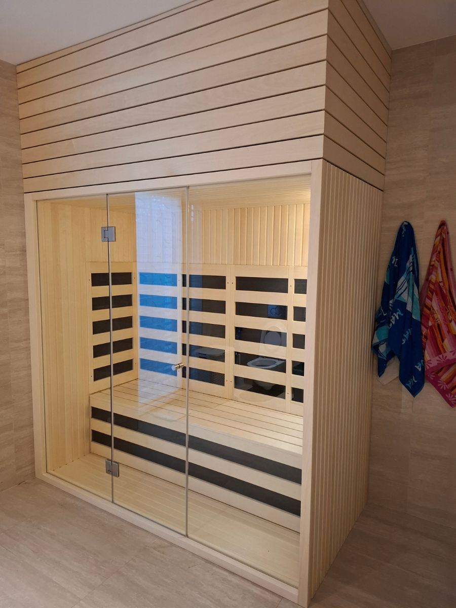 Savna je postavljena v zasebnem wellness prostoru ob tušu. Izdelana je iz kakovostnega lesa trepetlike brez grč in smole, kar zagotavlja prijetno izkušnjo savnanja. Opremljena je s karbonskimi infrardečimi grelci, ki omogočajo učinkovito pregrevanje telesa in intenzivno potenje tudi pri nižjih temperaturah. Zaključena je z leseno oblogo, ki se povezuje z oblogo prostora in sega vse do stropa.